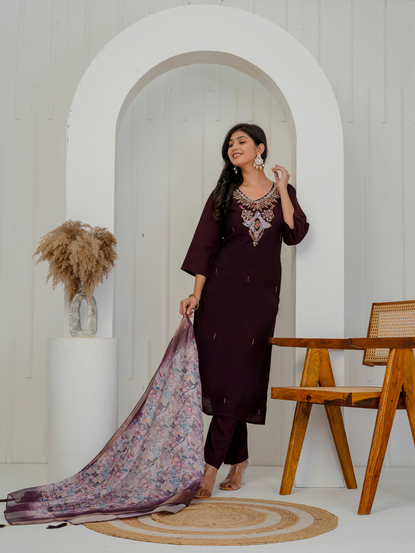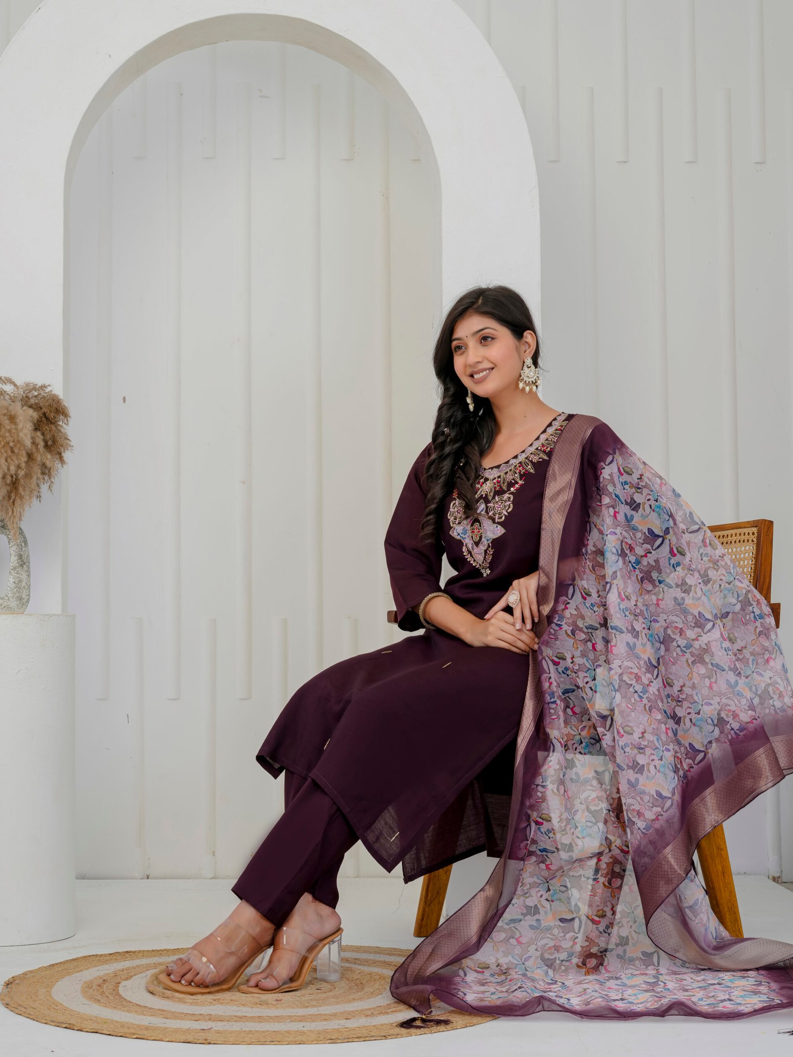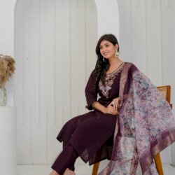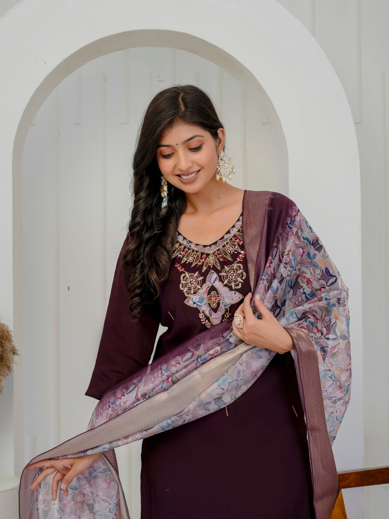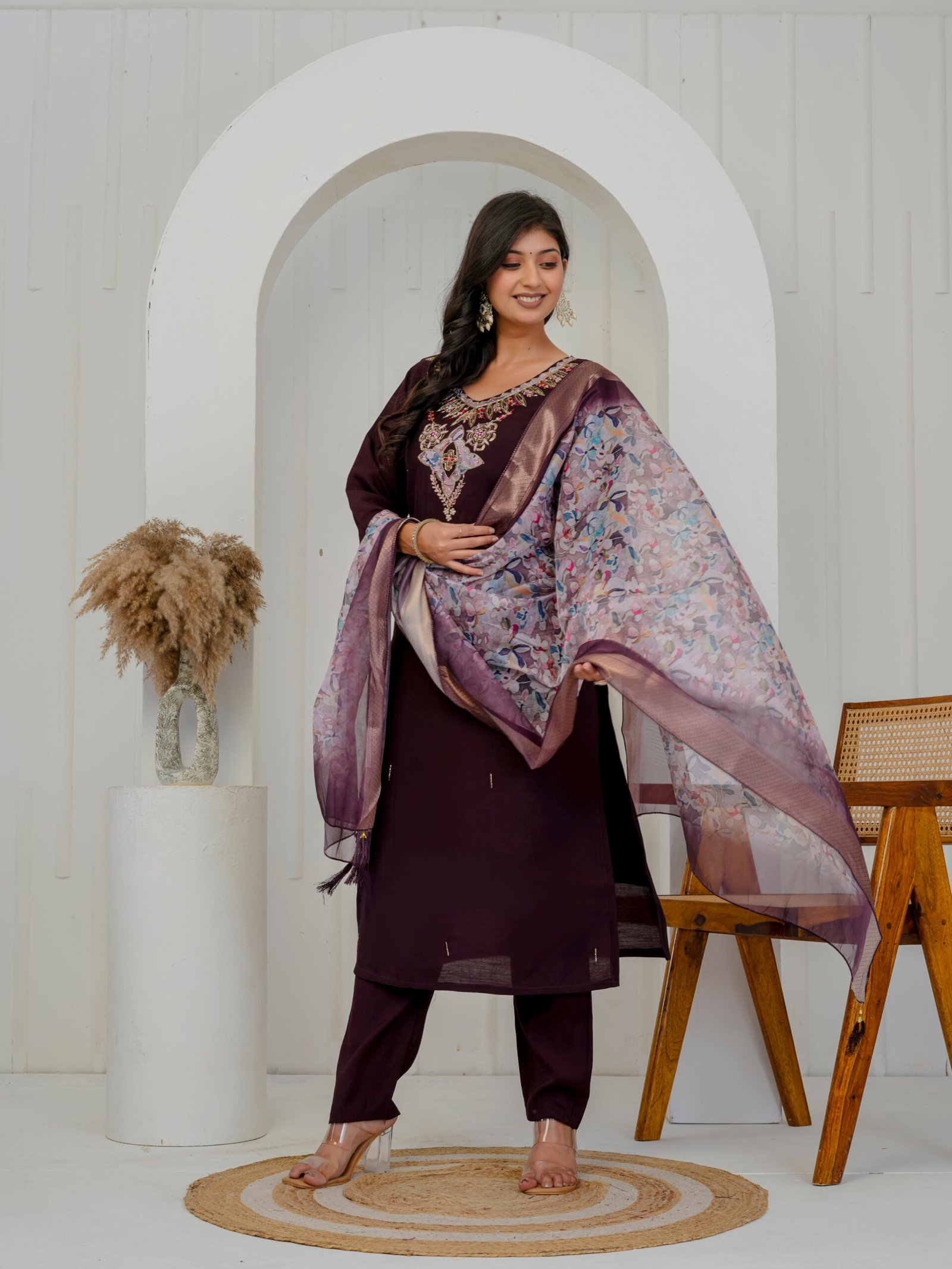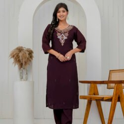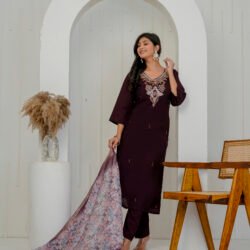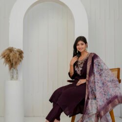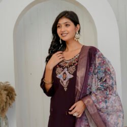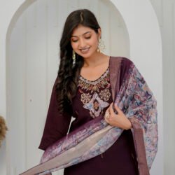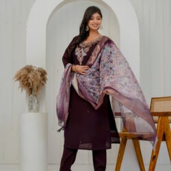 Enhance your festive wardrobe with this elegant plum wine kurta set. Crafted from a luxurious silk-blend fabric, the straight kurta features intricate embroidery on the neckline. Embroidered floral motifs with sequins and heavy handwork add a rich and graceful appeal to the ensemble. It is paired with matching straight trousers and a beautifully printed sheer dupatta with zari border, making it perfect for celebrations and special occasions.