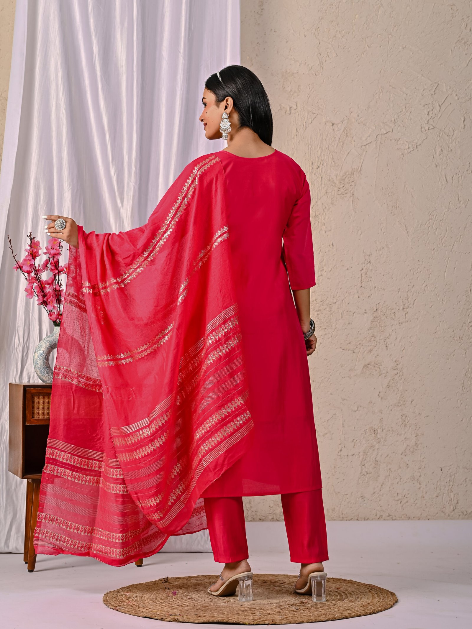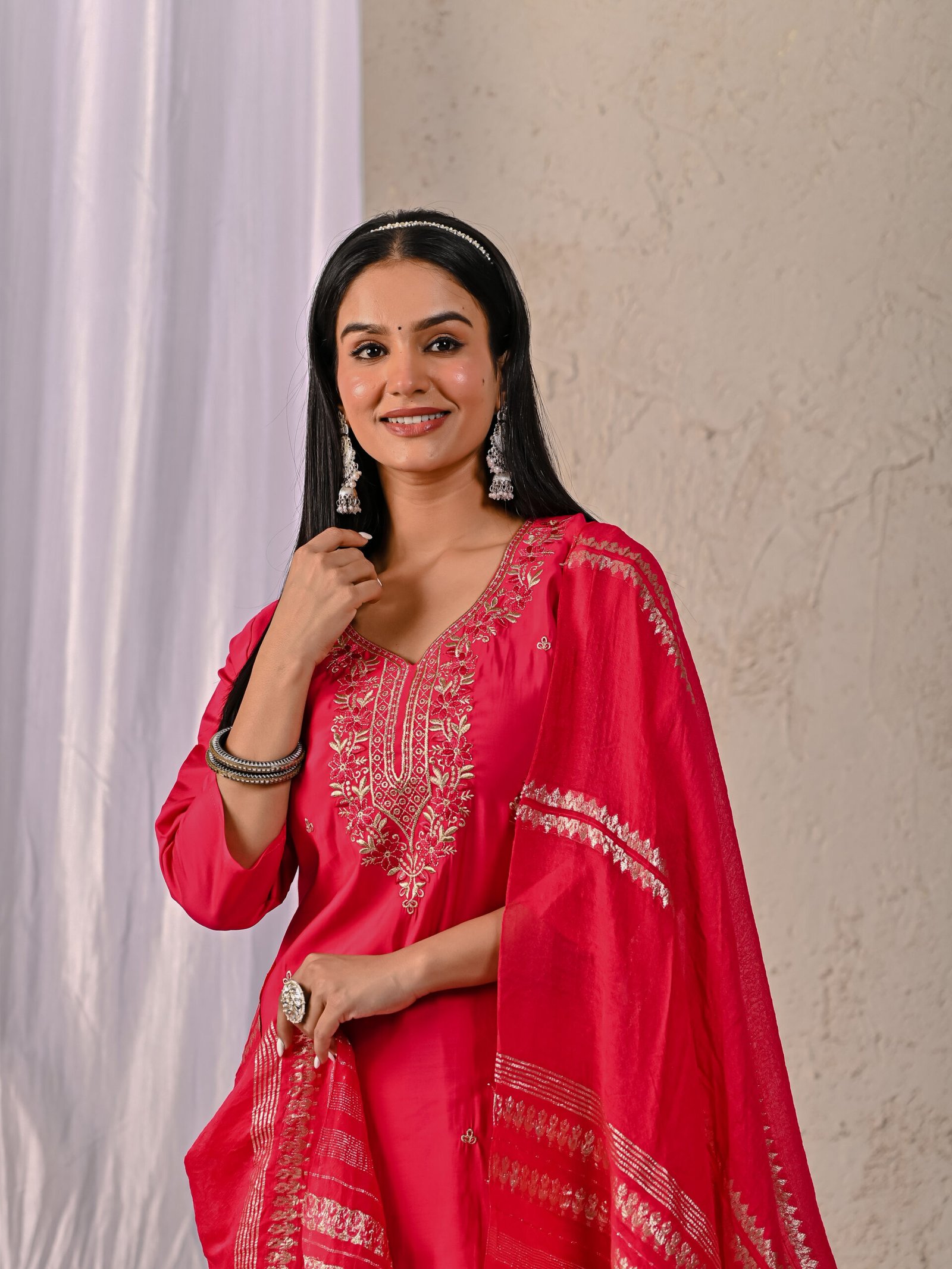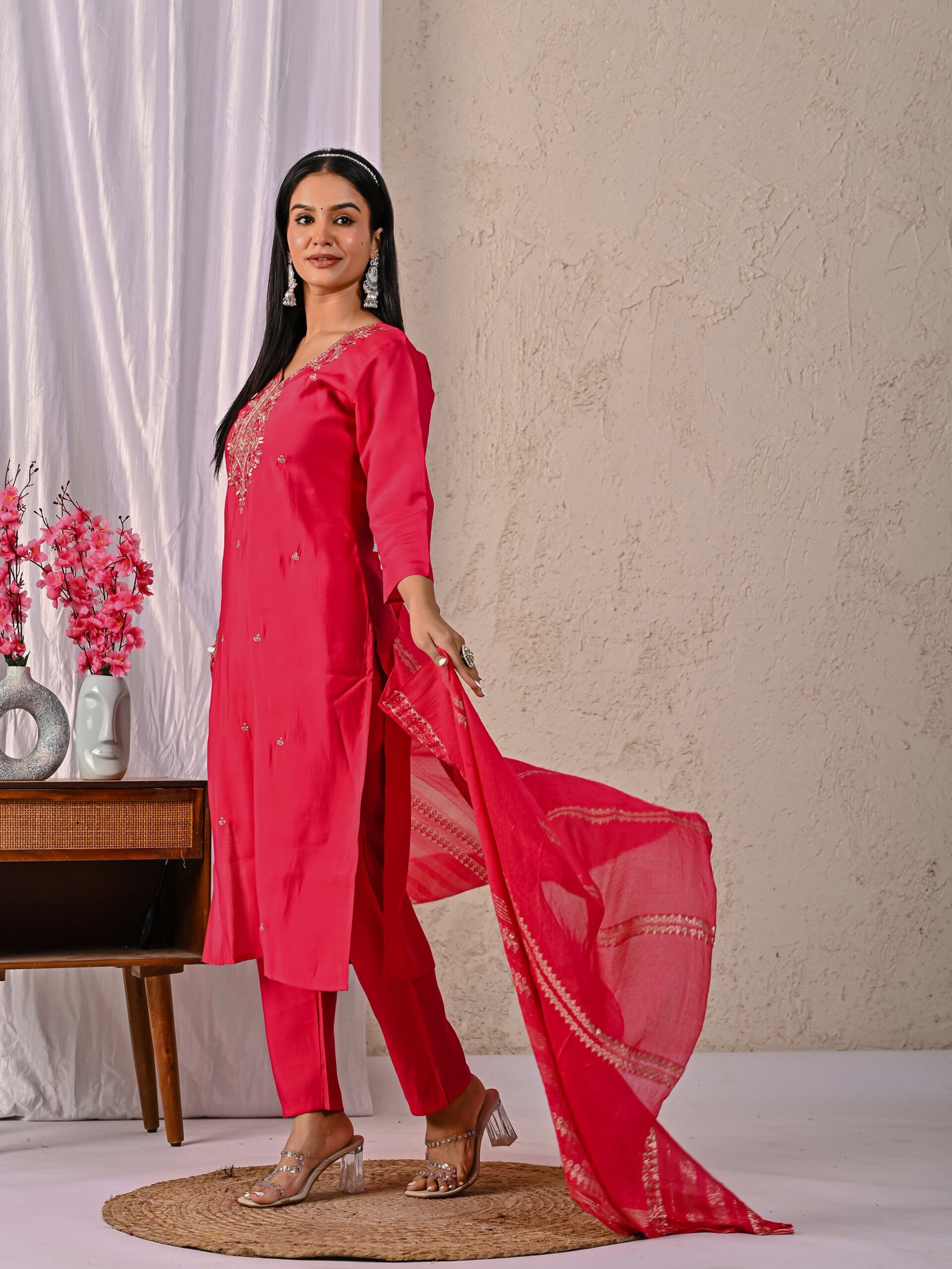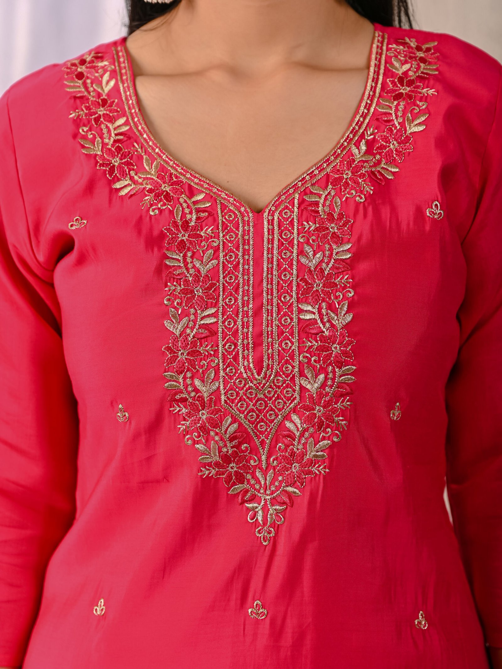 Enhance your festive wardrobe with this elegant Rani Pink embroidered kurta set. Crafted from a rich silk-blend fabric, the straight-cut kurta features intricate floral embroidery on the neckline and delicate motifs across the body. Paired with matching straight trousers and a lightweight zari-detailed dupatta, this ethnic ensemble offers timeless charm and comfort for special occasions.