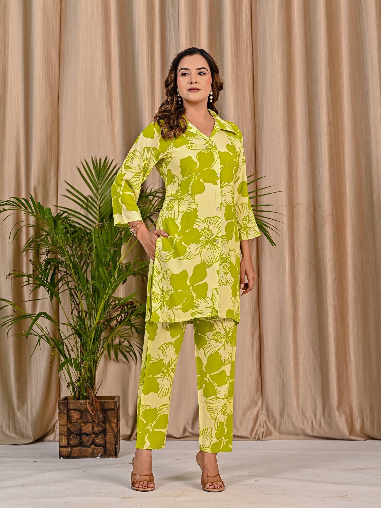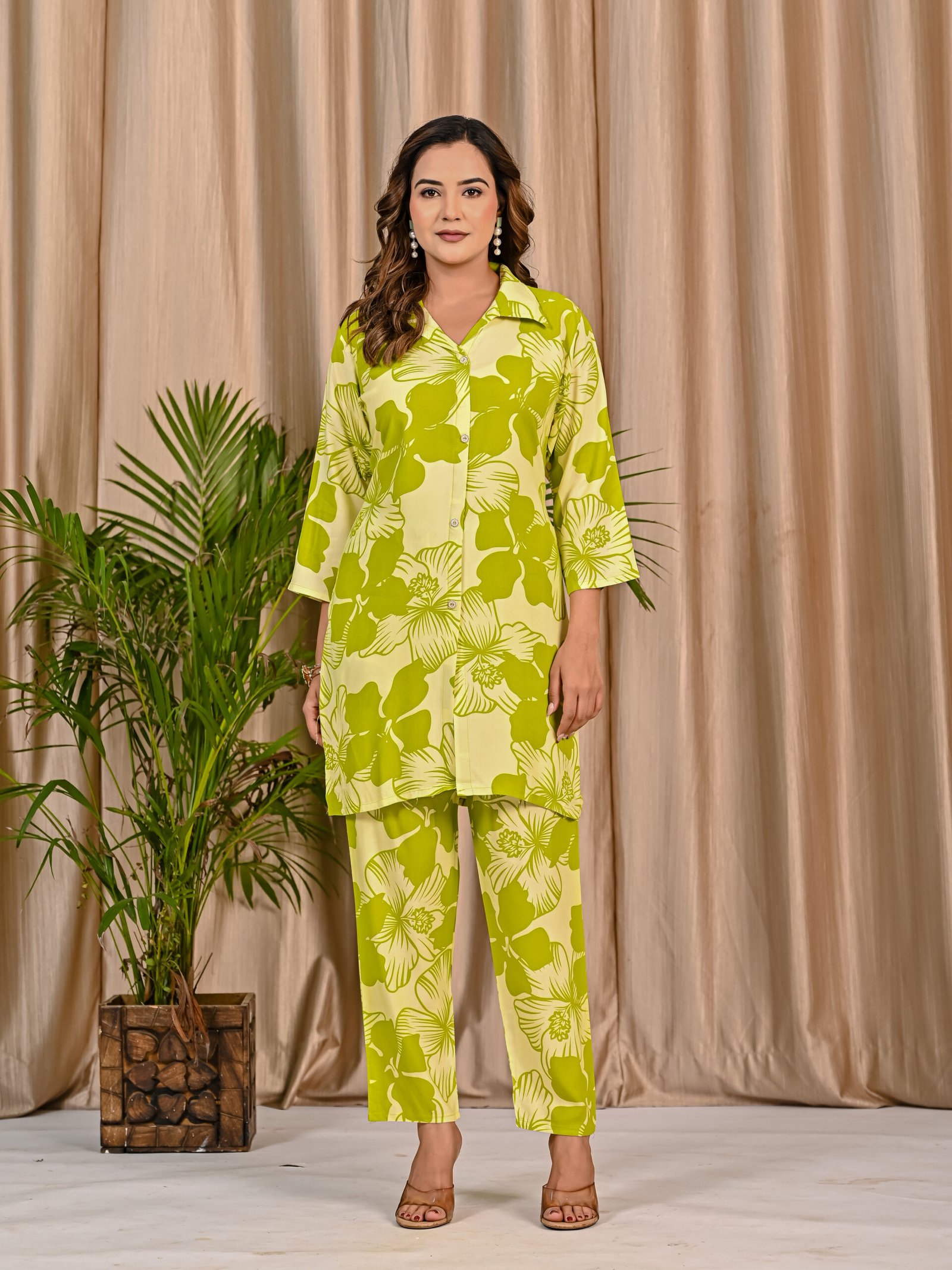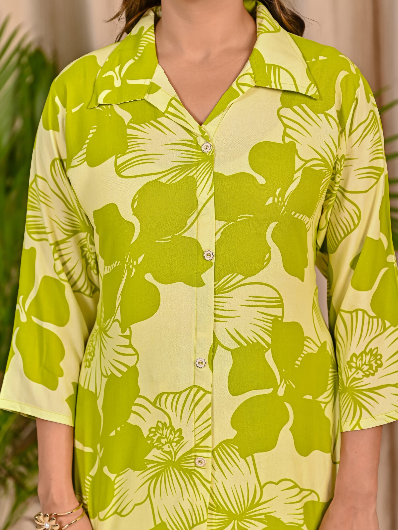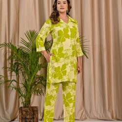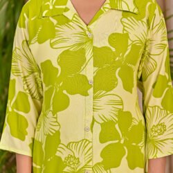Refresh your everyday wardrobe with this stylish Green and Light Green co-ord set. Crafted from soft and breathable viscose rayon fabric, the shirt-style top features a classic collar, front button placket, and elegant three-quarter sleeves. The all-over floral print adds a lively and modern touch. Paired with matching straight-fit pants featuring a comfortable elasticated waist, this co-ord set offers effortless style and comfort for casual outings and daily wear.