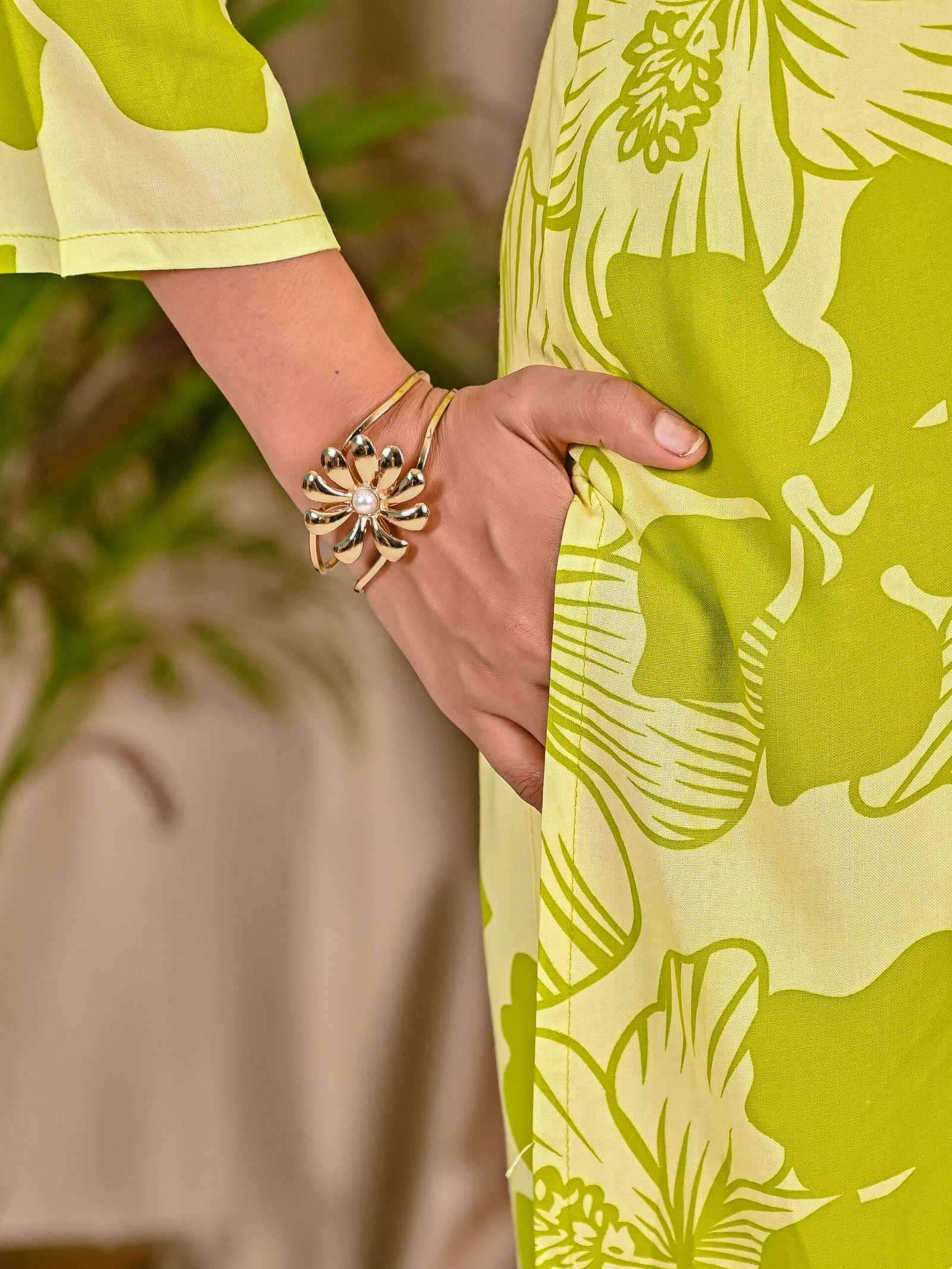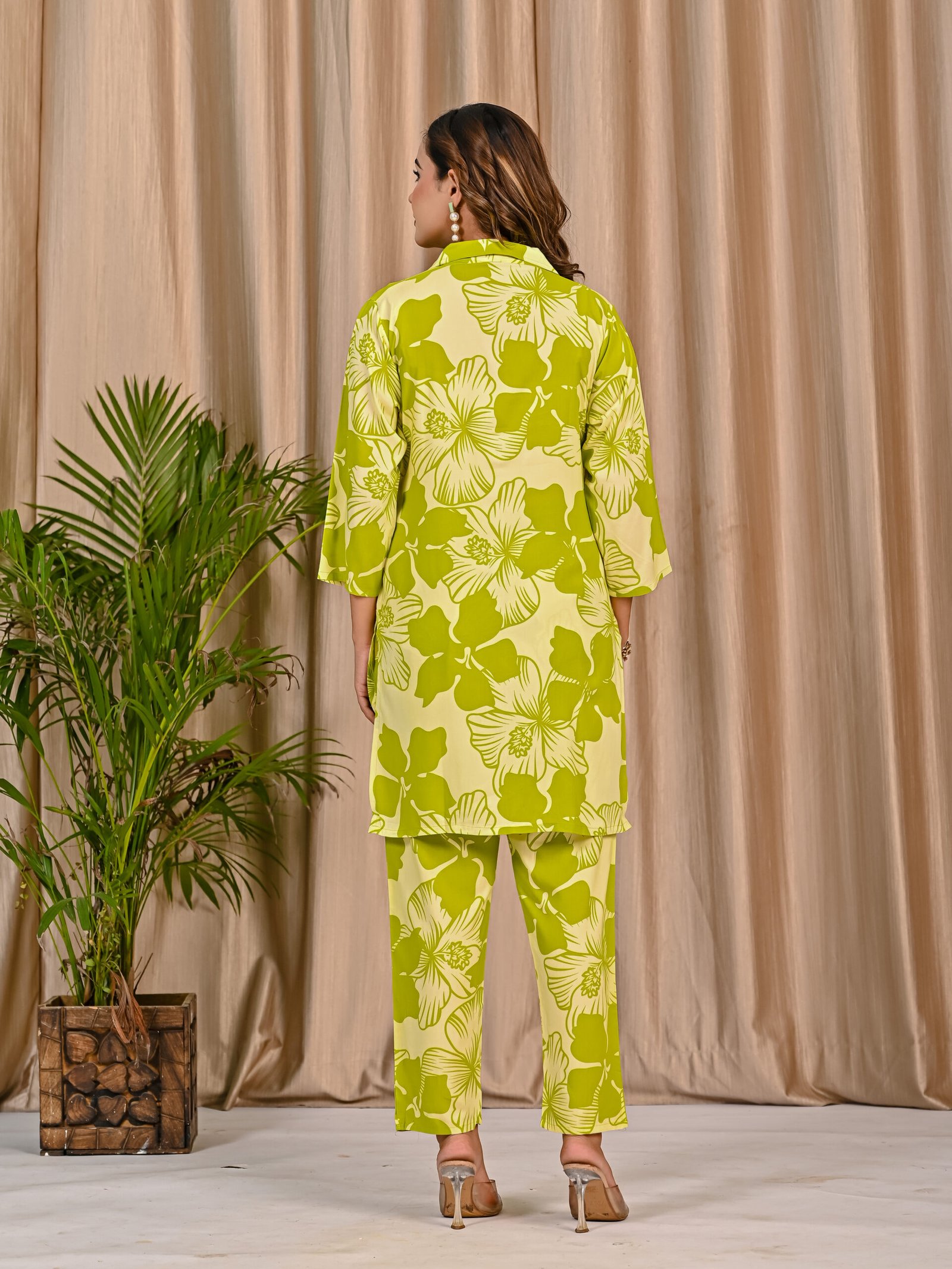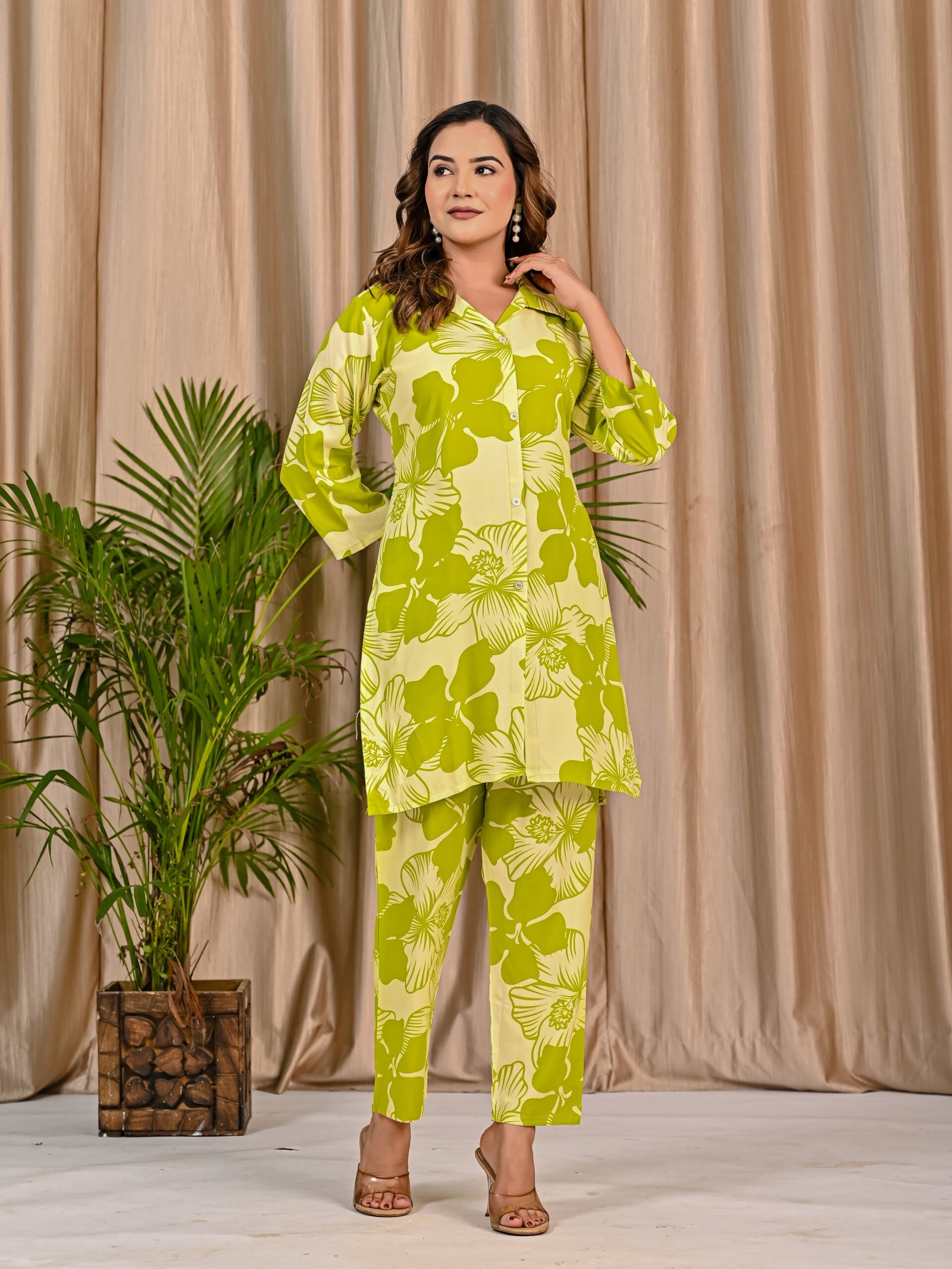 Refresh your everyday wardrobe with this stylish Green and Light Green co-ord set. Crafted from soft and breathable viscose rayon fabric, the shirt-style top features a classic collar, front button placket, and elegant three-quarter sleeves. The all-over floral print adds a lively and modern touch. Paired with matching straight-fit pants featuring a comfortable elasticated waist, this co-ord set offers effortless style and comfort for casual outings and daily wear.